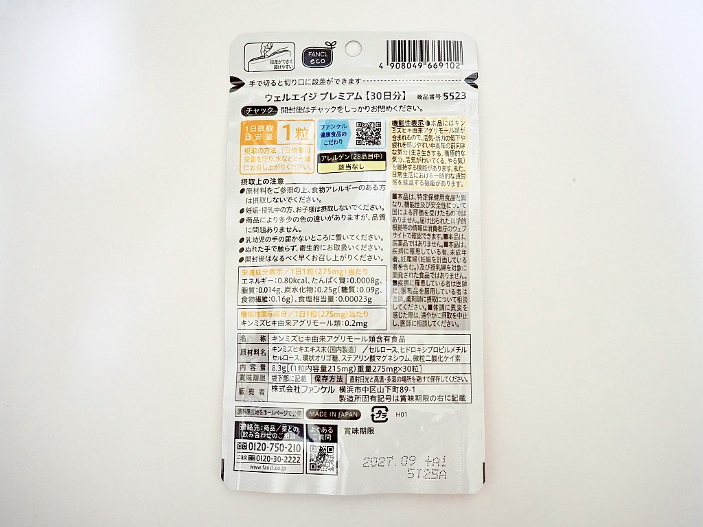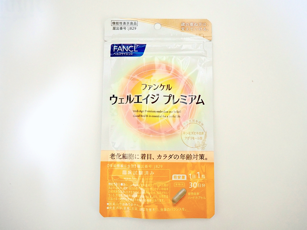 ウェルエイジ プレミアムは株式会社ファンケルが開発した加工食品(錠剤、カプセル剤等) のヒト試験済み機能性表示食品です。ウェルエイジ プレミアムに含まれる機能性関与成分「キンミズヒキ由来アグリモール類」は活気・活力の低下や疲れを感じやすい中高年の前向きな気分(生き生きする、積極的な気分、活気がわいてくる、やる気)を維持する作用があります。また、日常生活における一時的な疲労感を軽減する作用があり、健常な中高年者に適しています。
