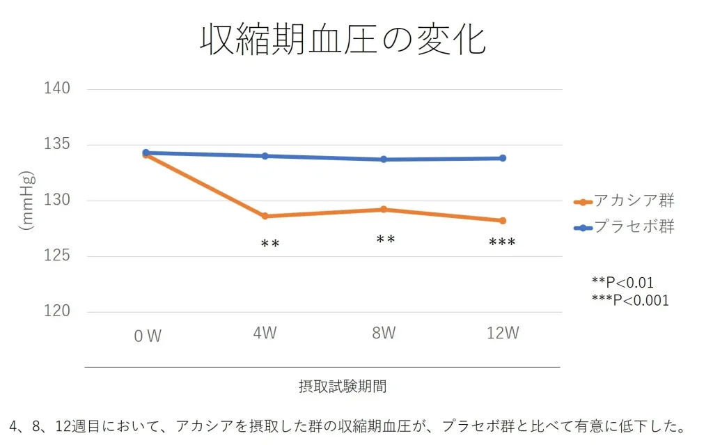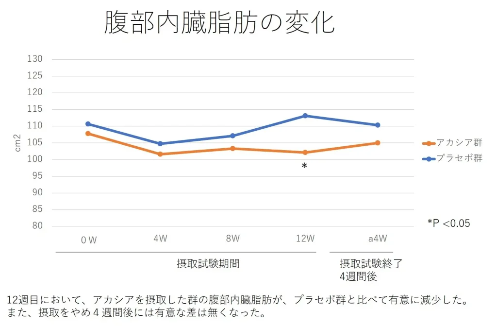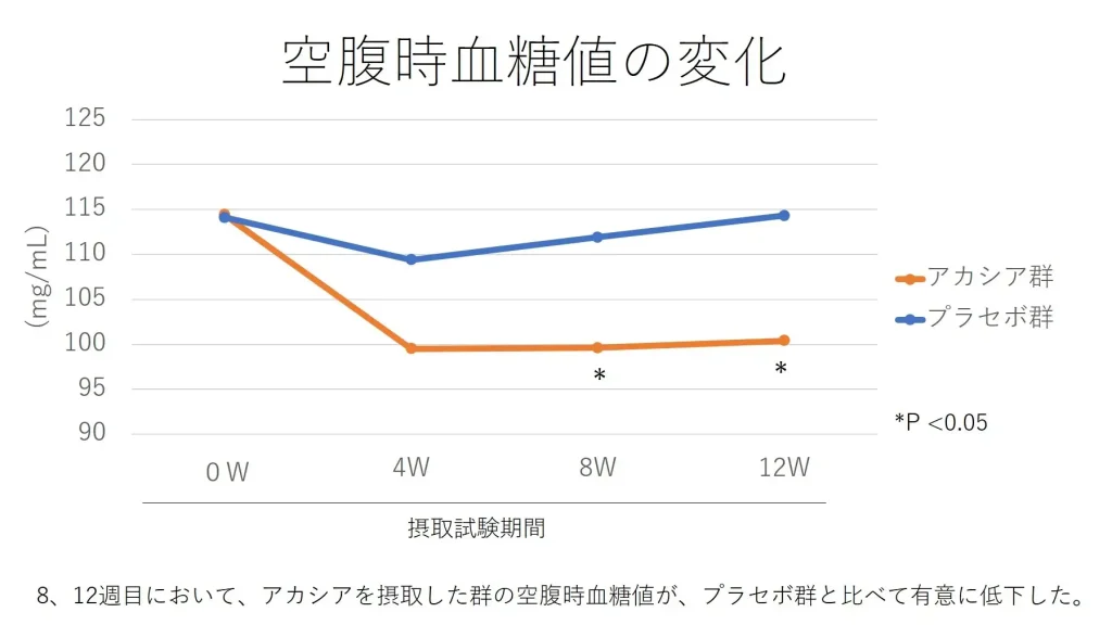 空腹時血糖値が高め(110 mg/dL以上125 mg/dL以下)の健常な日本人成人男女を対象に、ランダム化プラセボ対照二重盲検並行群間比較試験を実施しました。試験参加者を本試験食品群およびプラセボ群に割り付け、12週間にわたって本試験食品あるいはプラセボを1日6粒摂取させ、主要アウトカムとして摂取12週間後における空腹時血糖値、その他副次的アウトカムについて評価しました。試験の結果、プラセボ群と比較して、摂取8、12週間後の空腹時血糖値が有意に低値を示しました 。また、「12wにおける空腹時血糖値が110 mg/dL未満の症例数の割合」はアカシア群がプラセボ群よりも有意に高い傾向にありました。